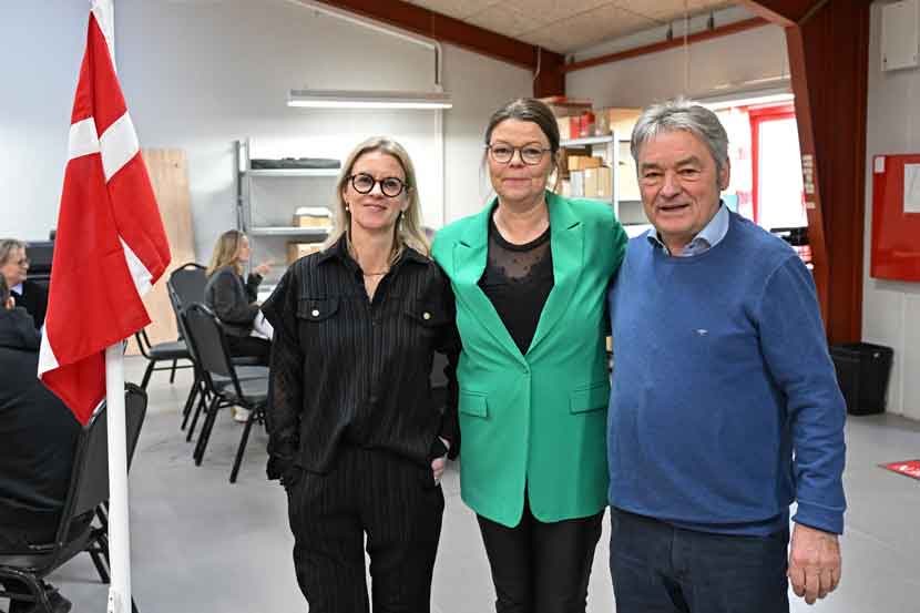(Billedtekst: Jubilaren Winnie Ravn Andersen er omgivet af cheferne i de 30 år, Anette og Viggo Momsen, ved formiddagens markering af de 30 år. Foto: migogvejen©)