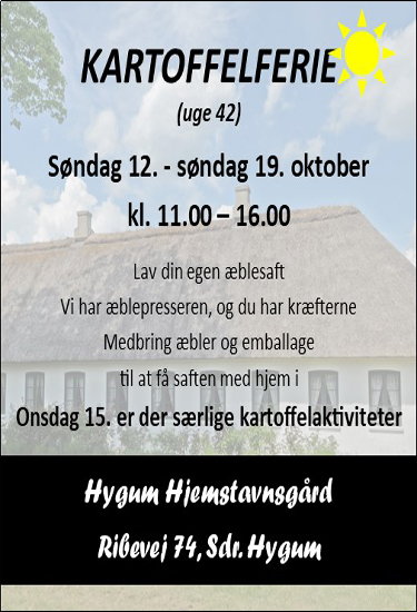 Mange tæller ned til årets efterårsferie, der starter i weekenden. Eller kartoffelferie, som det hed i gamle dage, og som kan opleves på Hygum Hjemstavnsgård i Sdr. Hygum. (læs videre under annoncen) (tryk på annoncen og se mere) Hver dag i efterårsferien fra søndag 12. til søndag 19. kan du komme...