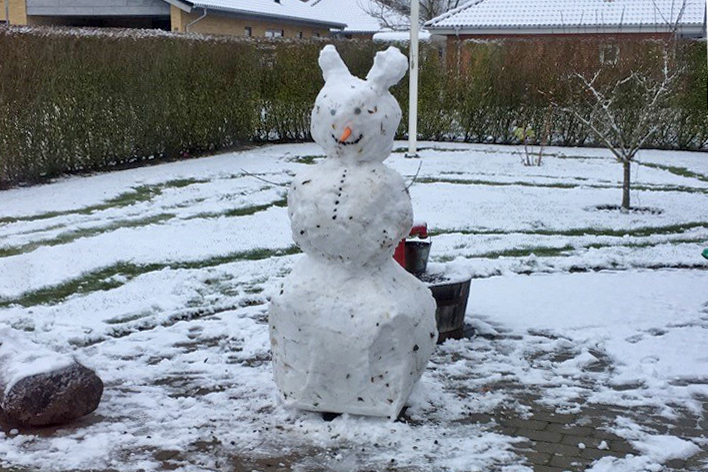 Vinterens første store snefald kom belejliget i weekenden, og det fik mange til at komme ud i sneen. Der blev kælket, kørt på slæde og lavet snemænd som her i Rødding, hvor det er 10-årige Maja Lyhne Bertelsen, der nød sneen i fulde drag og fik tryllet denne snemand frem.