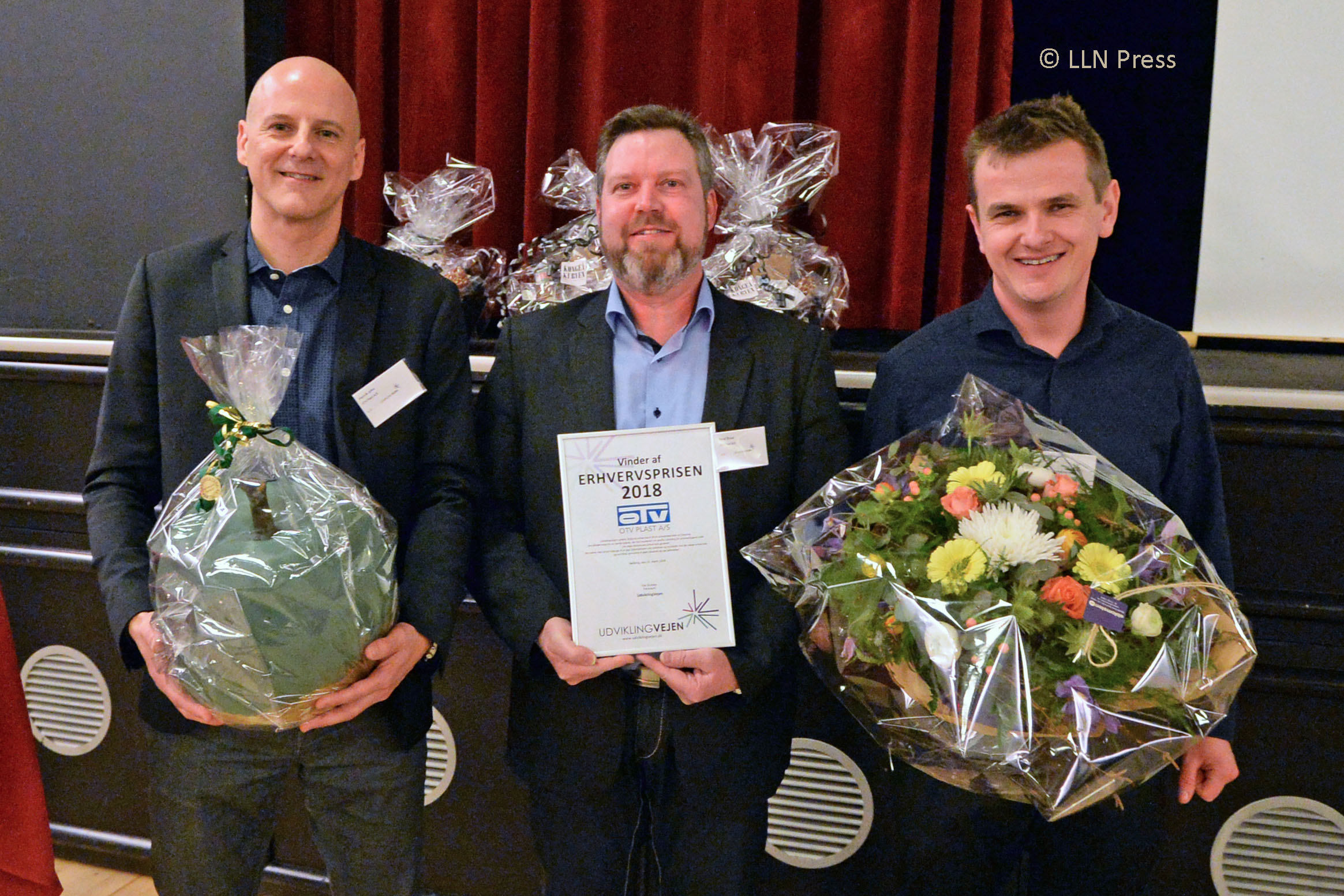 OTVs direktør, Henrik Jylov, og et par af medarbejderne, Rene Bruus og Claus Boysen, fotograferet efter modtagelsen af Udvikling Vejens erhvervspris 2018. Plastvirksomheden OTV i Vejen fik onsdag aften overrakt Udvikling Vejens erhvervspris 2018. Det skete under spisningen i forbindelse med...
